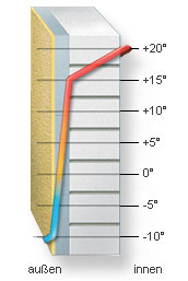 Der Temperaturverlauf in einer außen gedämmten Kalksandsteinwand zeigt die Vorteile der WDV-Systeme: Kälte und Hitze gelangen nicht bis zum Mauerwerk, thermische Spannungen werden verhindert, höhere Temperaturen im Wandquerschnitt verhindern Tauwasserbildung.