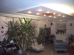 In den Wohnraum wurde die Decke mit einem Innensilikatputz verputzt und mit Bio-Sylitol gestrichen. Die Wände wurden mit einer Vliesfasertapete tapeziert und mit einer Wellnessfarbe gestrichen. Auf die Deckenplatte wurde Glasfaser und Spachteltechnik aufgebracht.